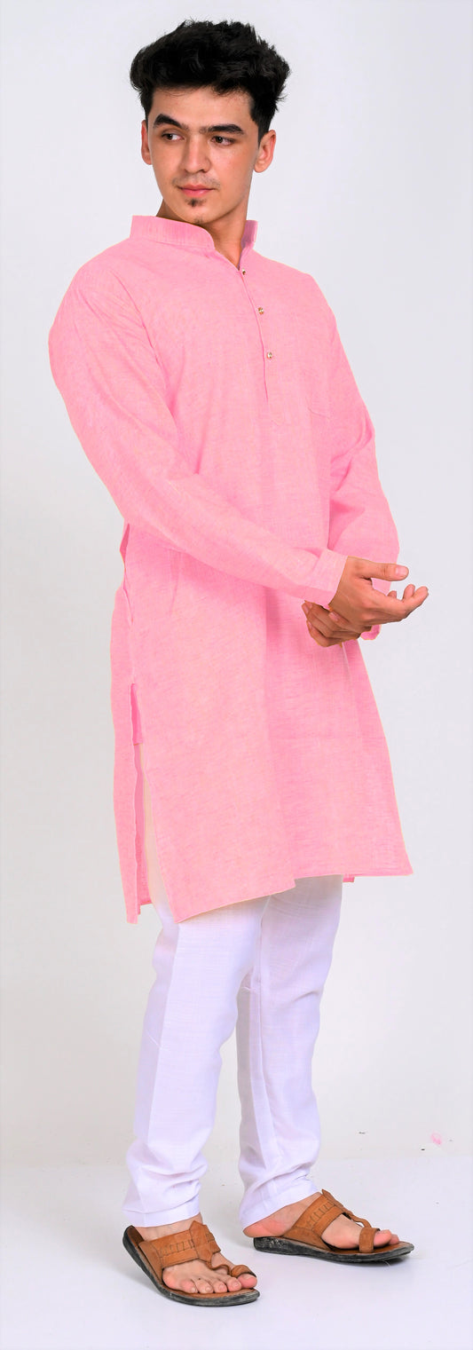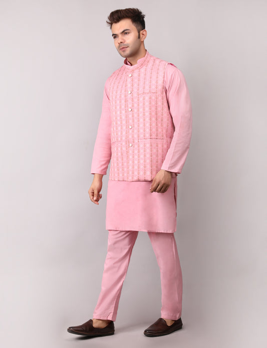 Men's Silk Blend Kurta Pajama with Designer Bundi Nehru Jacket/Waistcoat Pink