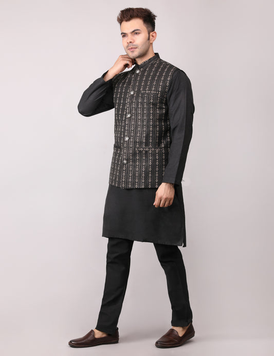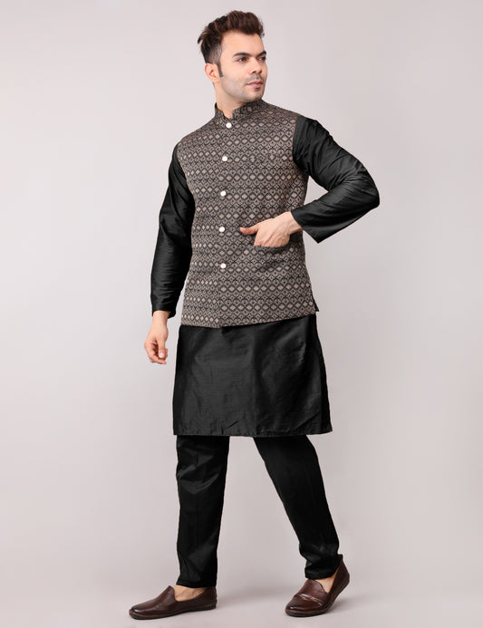 Men's Silk Blend Kurta Pajama with Designer Bundi Nehru Jacket/Waistcoat Black