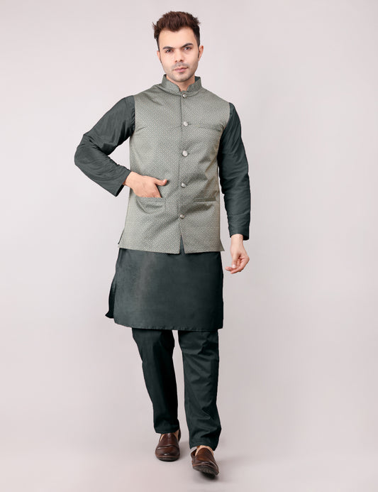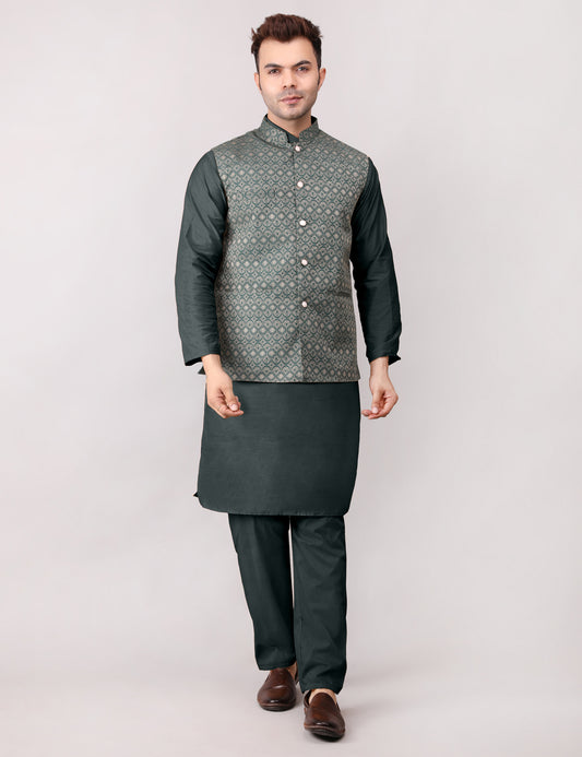 Men's Silk Blend Kurta Pajama with Designer Bundi Nehru Jacket/Waistcoat Dark Green