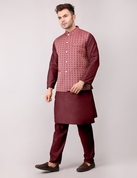 Men's Silk Blend Kurta Pajama with Designer Bundi Nehru Jacket/Waistcoat Maroon