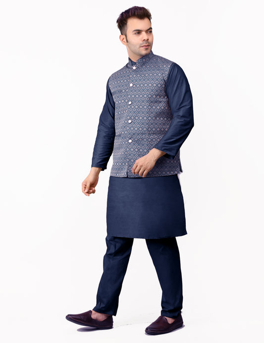 Men's Silk Blend Kurta Pajama with Designer Bundi Nehru Jacket/Waistcoat Dark Blue