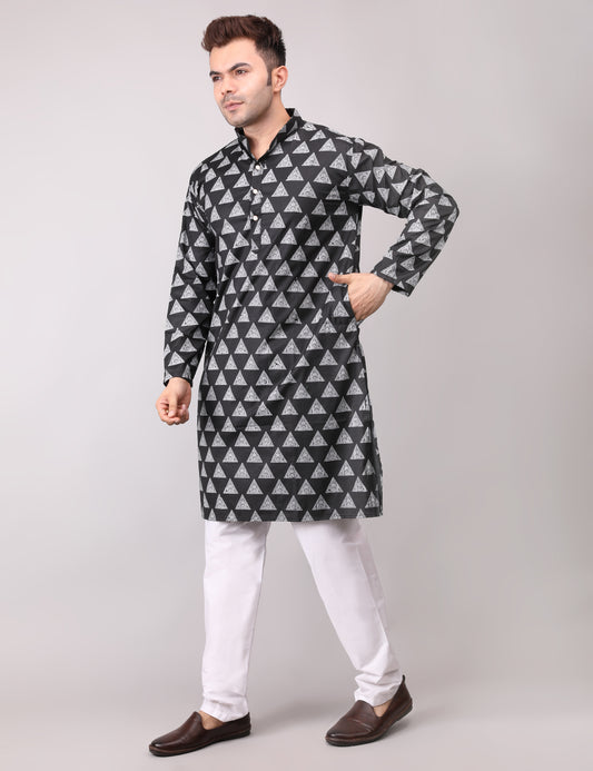 Men's Black Cotton Printed Kurta Pajama Set