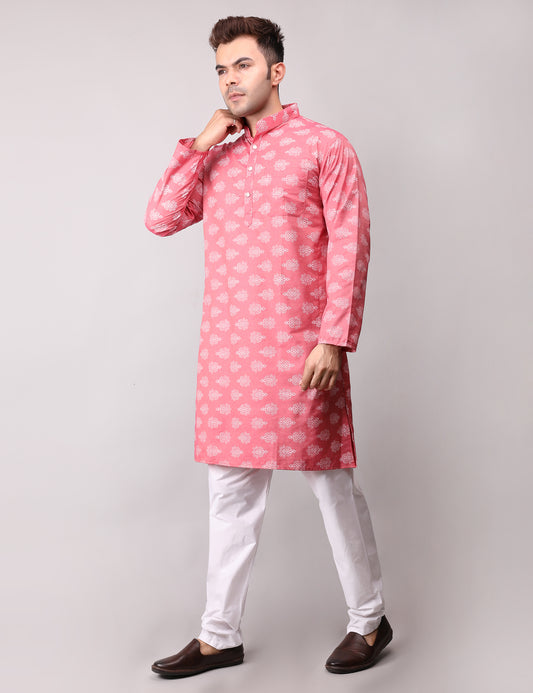 Men's Pink Cotton Printed Kurta Pajama Set