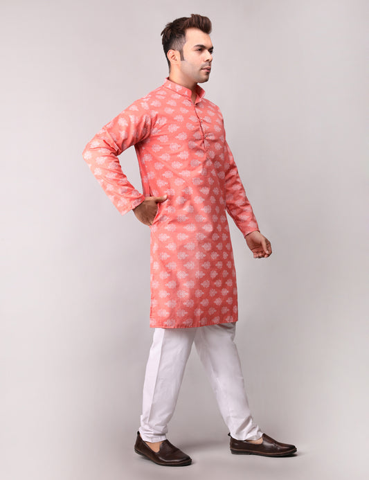 Men's Peach Cotton Printed Kurta Pajama Set